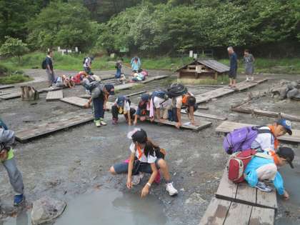 湯元温泉の源泉では,10円玉をお湯の中に入れ,色が変わる実験をしました。子どもたちは,謎の幼虫の存在が気になったようです。