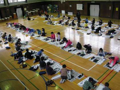 3学期が始まり,各学年が書き初めに取り組みました。3年生は,初めての毛筆での書き初めになりました。体育館で長い条幅紙に向かい,一筆ずつ緊張しながら「つよい力」と書きました。1月16日(木)から24日(金)の書き初め展で,ぜひごらんください。