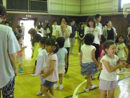 親子の触れ合いからスタートしました。ジャンケンしたり,手を引いてもらったり,一緒に体を動かしたりしました。お母さんやお父さんを他の兄弟に邪魔されず独占でき,子ども達は,嬉しそうにべたべたしていました。いつも教室にいる表情とは違う顔を垣間見ることができました。1年生にはまだまだスキンシップが大切な年齢です。