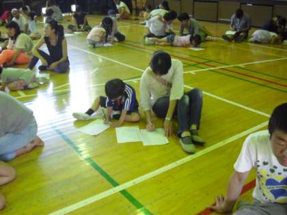 次は知らない大人と握手をするミッションです。これがなかなか手強い。もじもじしたり,友達と手を繋いで挑戦したり,取り敢えず知っている人に行ってみたり…一方意外な子が早々に5人のノルマを終えていました。最後は先生の質問に子どもが答え,その答えを保護者が想像して,幾つ合致するかのクイズです。なかなか先生の出題は難しく残念ながら満点パパ・満点ママはいませんでしたが,1問間違いの最優秀パパ・ママが各クラス1名ずついらっしゃいました。3学期は満点パパ・ママが続出することでしょう。保護者の方の背中に「ありがとう」のメッセージを大きく書きました。これはどの保護者の方にも伝わったことと思います。