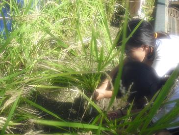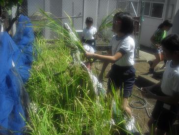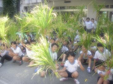 9月29日(月)に,5年生は総合的な学習の時間に育てている稲の収穫をしました。5月に素足で田植えした田んぼから,教室前の廊下にずらっと干せるほどの稲束がとれました。一週間ほど干しておきますので,学校へお越しの際にどうぞご覧ください。