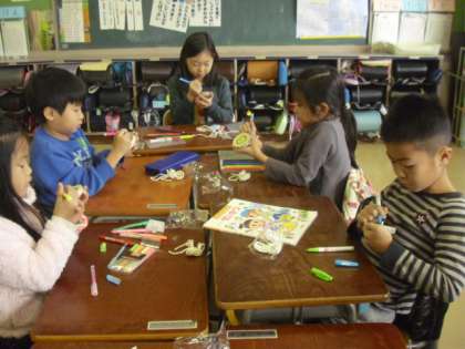 毎年,低学年は12〜1月に昔遊びに挑戦します。今年もこまは1人1個購入して,色を塗ったり,好きな絵を描いたりして,オリジナルこまを作ります。個性豊かな世界でたった1つのMYこまが完成しました。