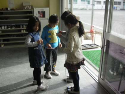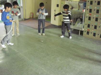早速,こま回しに挑戦です。最近は幼稚園や保育園でも昔遊びを取り入れているところが多いおかげで,上手な子が友達にひもの巻き方や投げ方のコツを教える微笑ましい光景が見られました。様子を見た主事さんや事務の先生方も教えてくださいました。1月のむかしあそび集会が楽しみです。