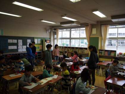 1年生の教室をのぞいてみると、6年生が休み時間にもお世話に来てくれていました。