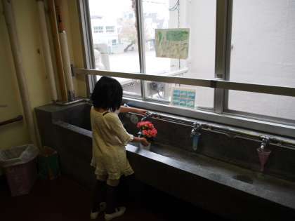 流しに通りかかると、花に水をやっている姿が。亀の水変えグループもやって来ました。