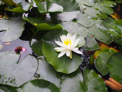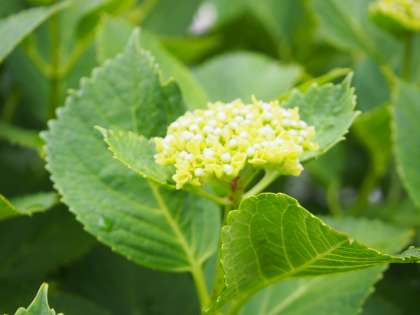 池にはハスの花が咲き、正門右手のアジサイは出番を待っているかのようです。