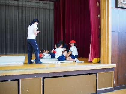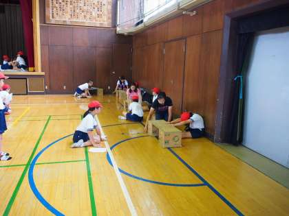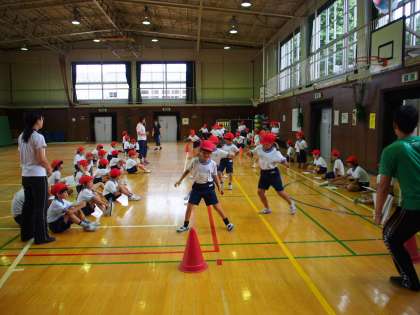 朝まで降った雨のために校庭を使うことができず、一部変更しての実施です。