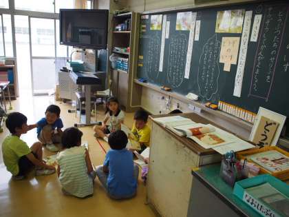 1年生は国語の学習、グループで相談しています。