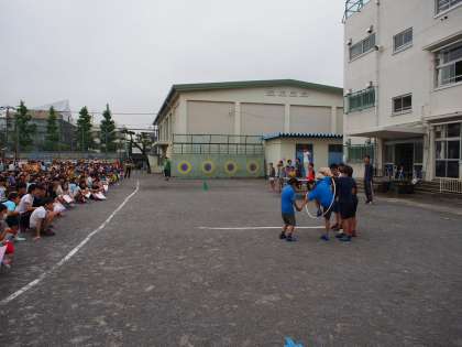 今日の集会は、縦割り班対抗のフラフープくぐりでした。