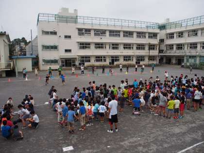 1年生から6年生までが手を繋ぎ、フラフープをくぐっていきます。