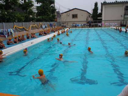 お日様や青空は見えませんが、梅雨のこの時季、プールに入ることができました。