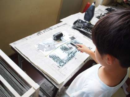 版にインクをローラーでつけます。