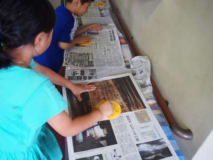 その上に紙をのせ、新聞紙をのせて、ばれんでこすります。