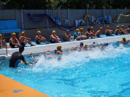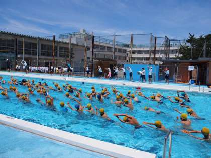 音楽に合わせて、水中で準備運動をするリズム泳をしています。