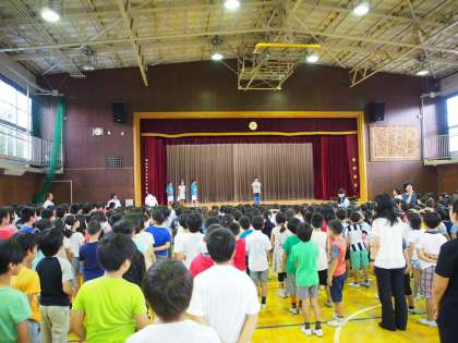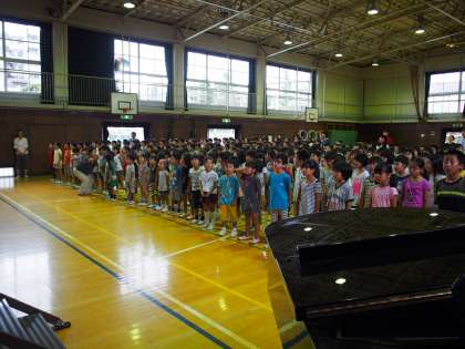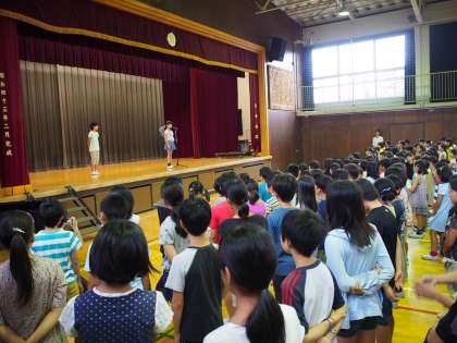 終業式では、校長の話の後、4年生の代表児童が夏休みにむけての話をしてくれました。