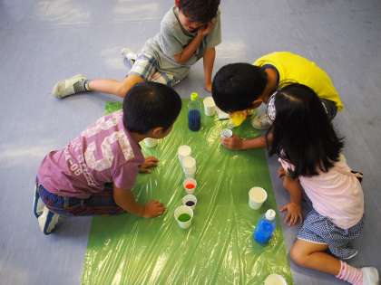 赤・青・黄の色水を混ぜて、何種類も色をつくります。