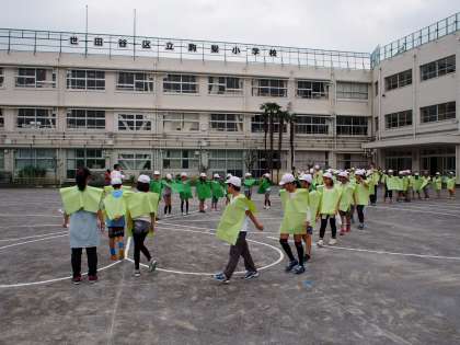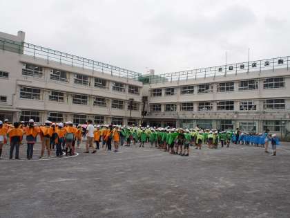 教室でカラーエプロンをつけて校庭に出ます。