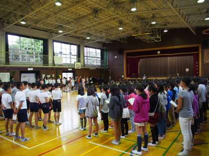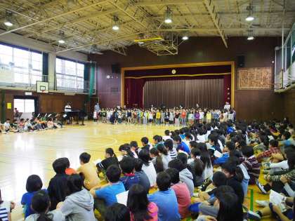 1・2年生は9月の歌「手のひらを太陽に」を、3〜6年生は9月の歌「南風にのって」を歌いました。