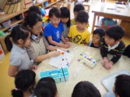 赤・青・黄・白の4色の絵の具から、2色を混ぜて色水を作ります。