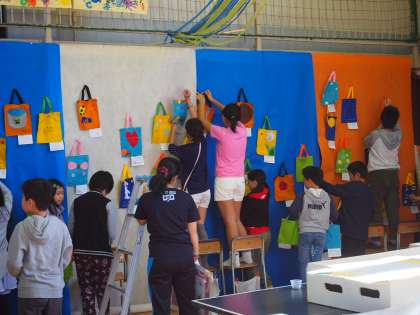 展覧会場となった体育館へ、作品の搬入・展示が進められています。