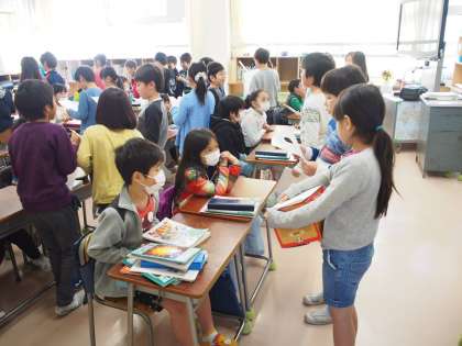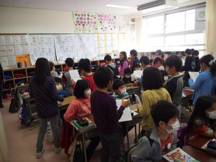 調べてまとめたことを、2年生に話して伝えます。