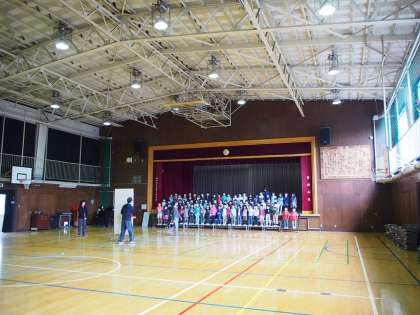 体育館のひな壇に並んで、元気な声で歌っていました。