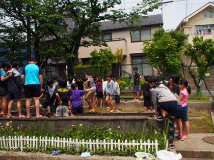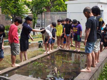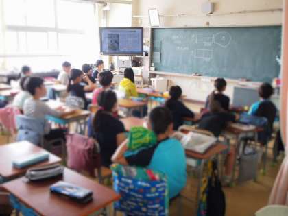 教室で田起こしについて学んだあと、学校の田んぼの田起こしを行います。