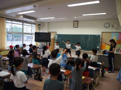 朝の時間に、応援団の人が1〜3年生の教室へ行き、応援の指導をしました。