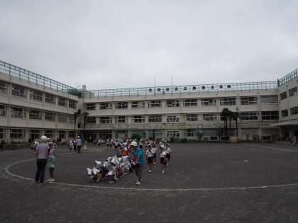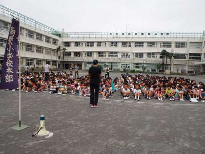 2階パソコン室から出火したため、東階段が使用できず、校庭に避難しました。