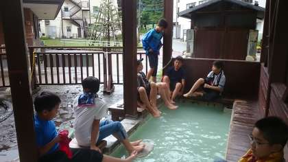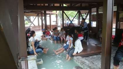 昼食前に、足湯と源泉に行きます。