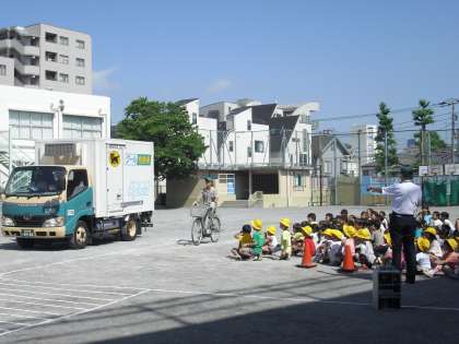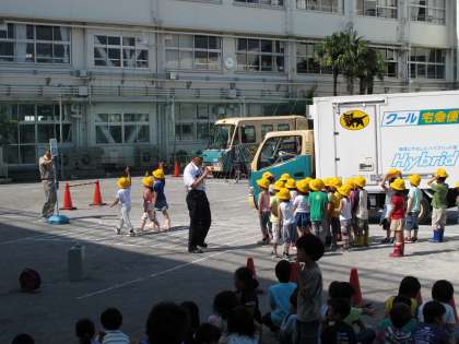 朝は雨模様でしたが、午後には夏の日差しが差しこみ校外委員さんの思いが天に通じたようです。今日の交通安全教室には1,2年生を中心に100名以上が参加しました。クロネコ運輸さんの全面協力で交差点での内輪差のことや正しい横断の仕方を教えてもらいました。「転ばぬ先のつえ」命を守る大切な勉強をしました。