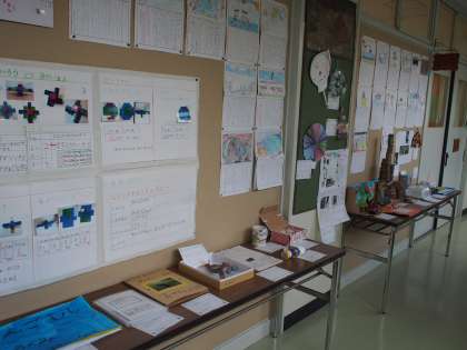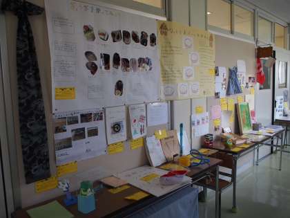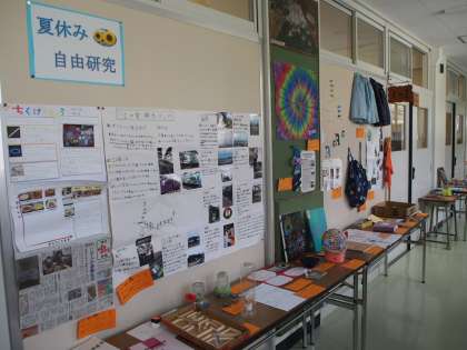 夏休みに研究した作品を教室前の廊下に展示しています。