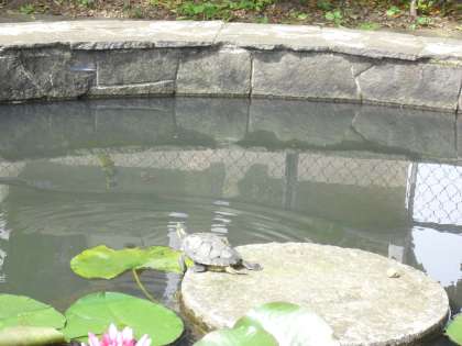 先日、お知らせした観察池に天気のよい日には、亀がコウラ干しをしています。なかなか用心深く近寄るとすぐに「ドボン」と池にとびこんでしまいます。いつ、だれが池に入れたのでしょう?。名前は私が勝手に「ななまる」と呼んでいます。