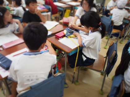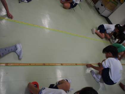 ものさしや巻尺で長さを測りました。長いものを測るときに巻尺が便利なことに気付きました。