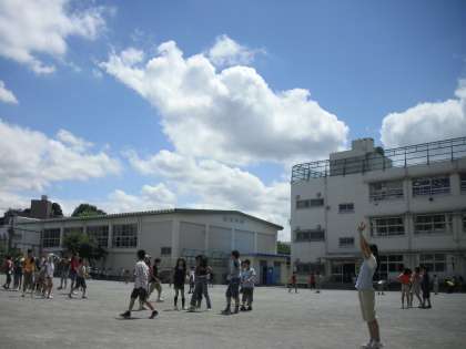 今日の昼休み、雲間からカーッと太陽が出て空には白い大きな雲と青空が広がりました。校庭では子どもたちが元気に遊んでいました。夏は近いぞー!
