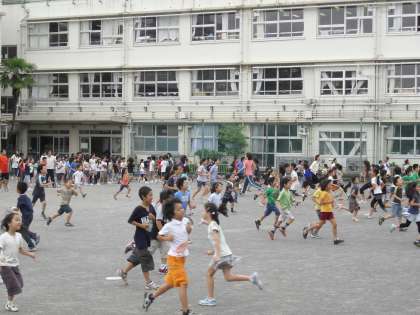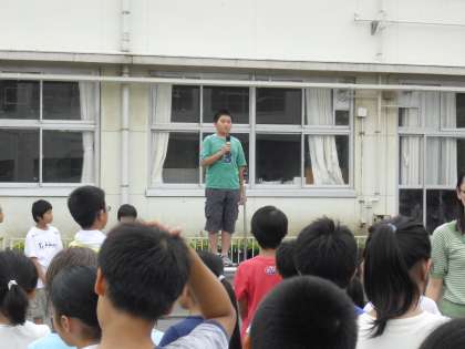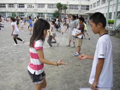 梅雨空のもと今朝はたてわり班集会で「関所やぶり」というゲームをしました。班の一人一人がじゃんけんをして勝てばよいのですが負ければ班員全員が走ります。運動量のある楽しいゲームでした。