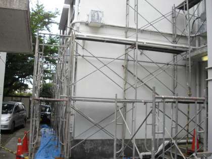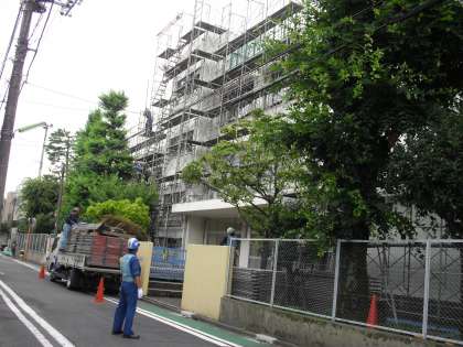 夏休みに計画されている工事ですが、すでに足場かけ工事が始まっています。子どもたちに支障の無いよう校舎裏から始めています。
