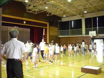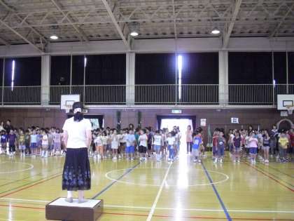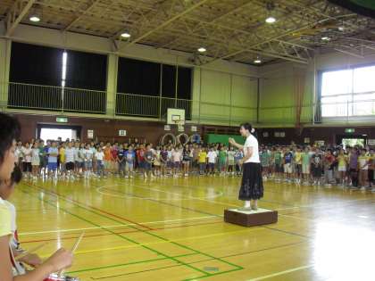 今日は全員で「我は海の子」を合唱しました。この時季は全員が体育館に集まると自然とあせが出てくる蒸し暑さですが、みんな大きな声で海を想像しながら歌いました。退場の時、「我は海の子」を歌いながら行進していたのが印象的でした。