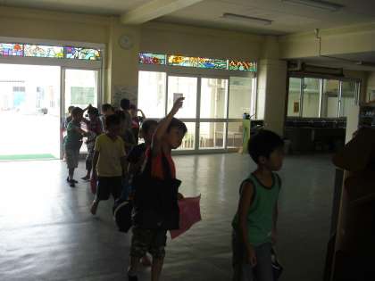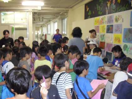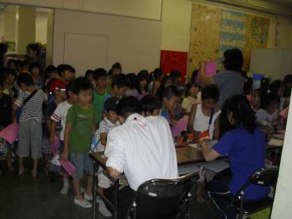 暑さ続きでプール初日の今日はどの学年も大入りです。写真は低学年の受付の様子です。暑い日は「プールが一番!」子どもたちはよく知っています。