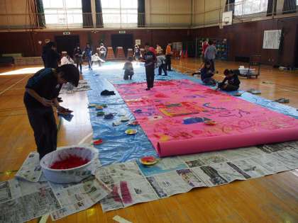 絵の具を手で触った感じから表したいことを考え、クラスで1枚の大きな画用紙に描きます。