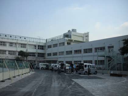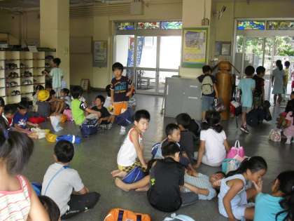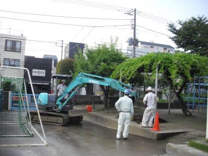 連日の暑さに負けず今日もたくさんの子どもたちが水泳に来ました。工事も進み、校庭は業者の車両で一ぱいです。