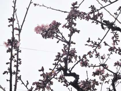正門横の梅は、つぼみを膨らませ、開き始めました。
