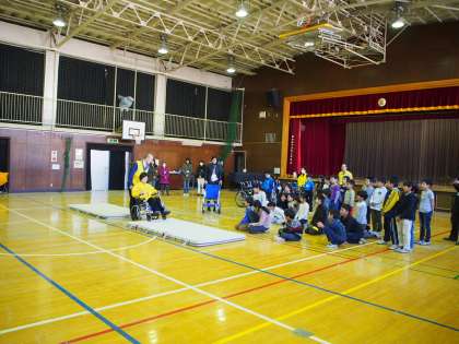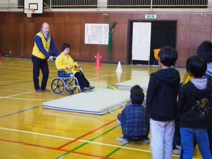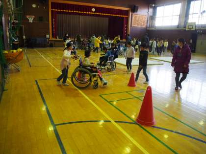 下馬地区社会福祉協議会の方をゲストティーチャーにお迎えし、体育館で車いす体験をしています。