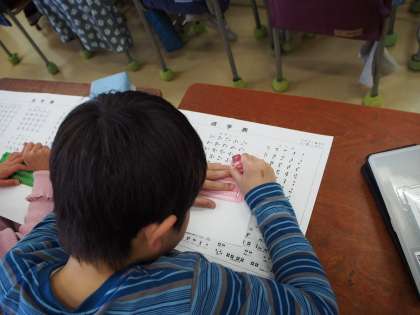教室では、点字体験をしています。