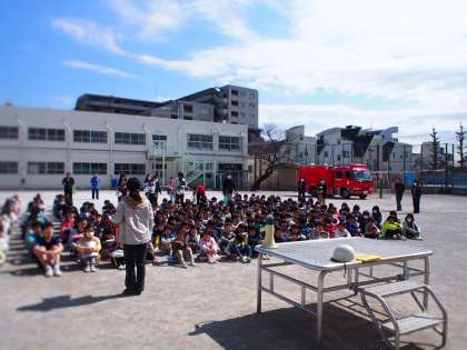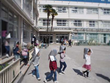 地震から火事が発生した想定で、西階段が使えず、防火扉を通って避難しました。