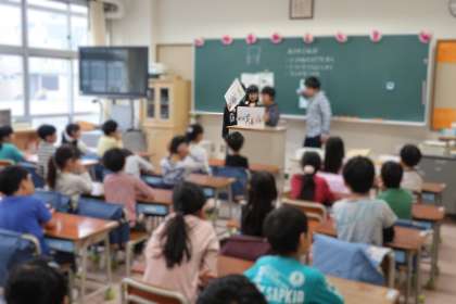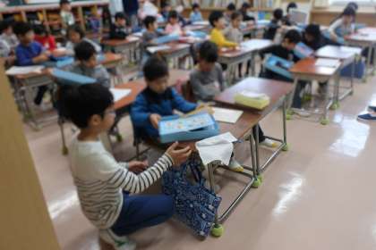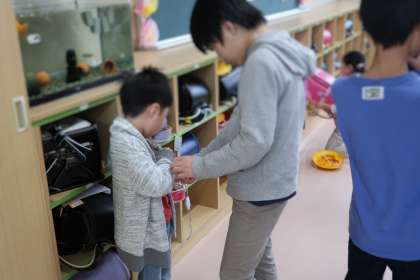 名札をつけること、道具箱を机の中にしまうこと、トイレは大丈夫か聞くことなど、6年生が優しく声をかけています。