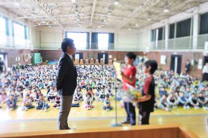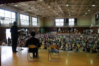 この春、駒繋小を去られた先生や主事さんが、お別れの挨拶をしに来てくれました。