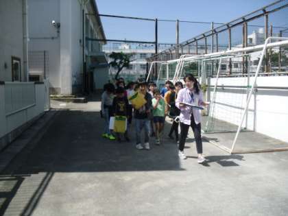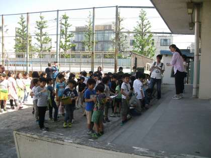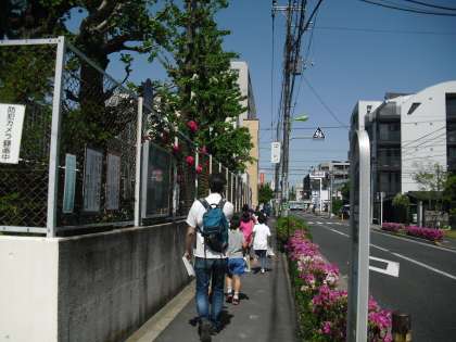 青空の下、3年生はグループごとに「まち探検」に出かけました。