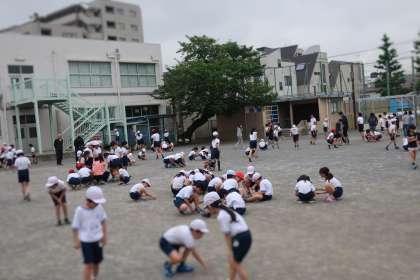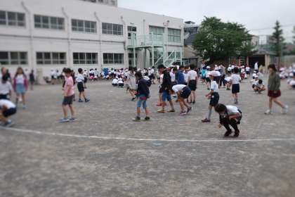全校朝会後、全校児童で校庭の石拾いをしました。