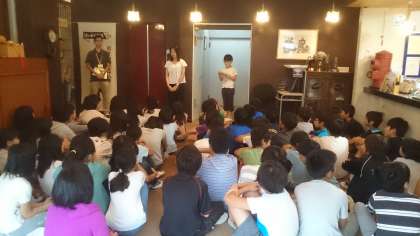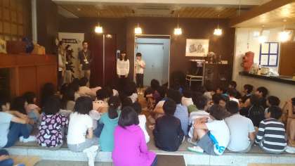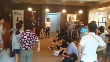 雨のため、宿者のロビーで朝会です。
